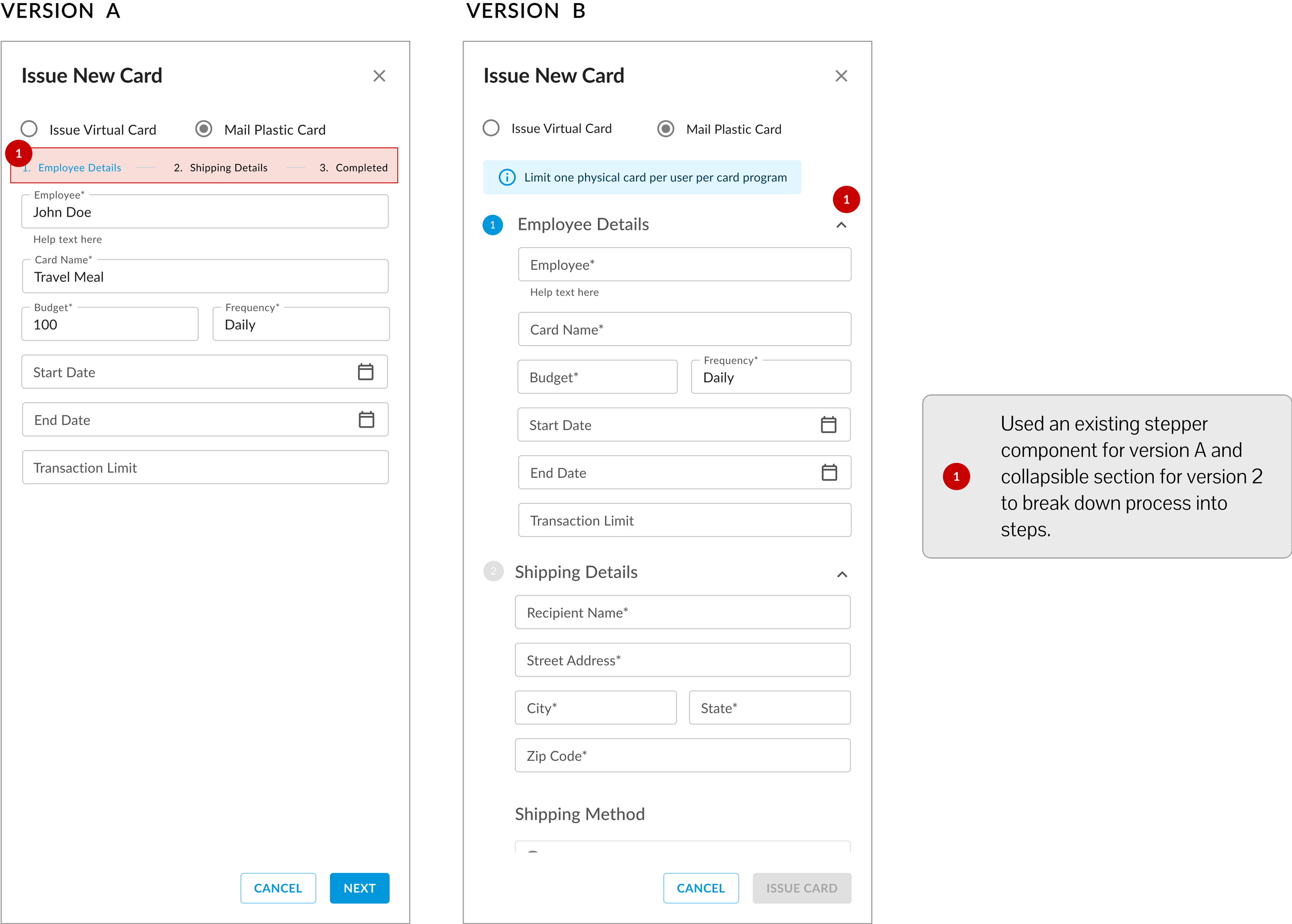 Shipping Methods Iterations: Explored various UI enhancements to introduce additional shipping options for physical card issuance.
